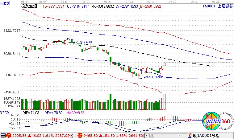 滬指1.61%,報收2905點(diǎn);深成指漲1.63%,報收9465點(diǎn);創(chuàng)業(yè)板漲0.53%,報收1629點(diǎn)。從板塊漲幅上看,水泥、白酒、中字頭股票、建筑、PPP概念、港口航運(yùn)等板塊上漲。滬股通凈流入17億,深股通凈流入10億。相應(yīng)的極反通道指標(biāo)的支撐壓力提示,如下圖所示: