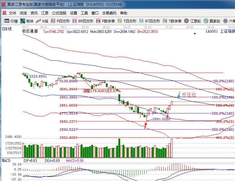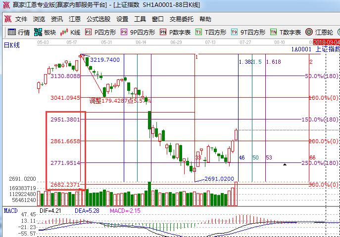 ★依據(jù)贏家江恩理論系統(tǒng)波段百分比延伸線提示:以5月21號高點(diǎn)為起點(diǎn),5月30號低點(diǎn)為終點(diǎn)做百分比延伸線如下圖,180度、零度對應(yīng)的是2771點(diǎn)、2861點(diǎn),2861零度位置不破,短線還有望向上2951靠近。