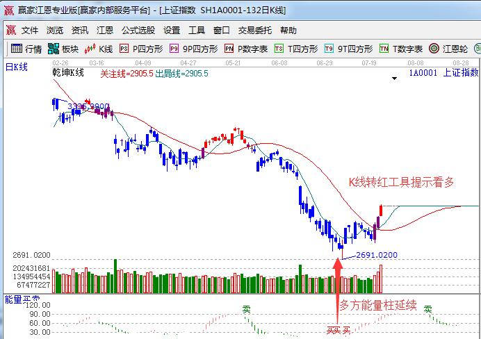 ★依據(jù)贏家江恩理論系統(tǒng)乾坤K線提示:20、23號藍(lán)色K線顏色轉(zhuǎn)紫,今日紫K線轉(zhuǎn)為紅色,按工具規(guī)則紅K波段看多。