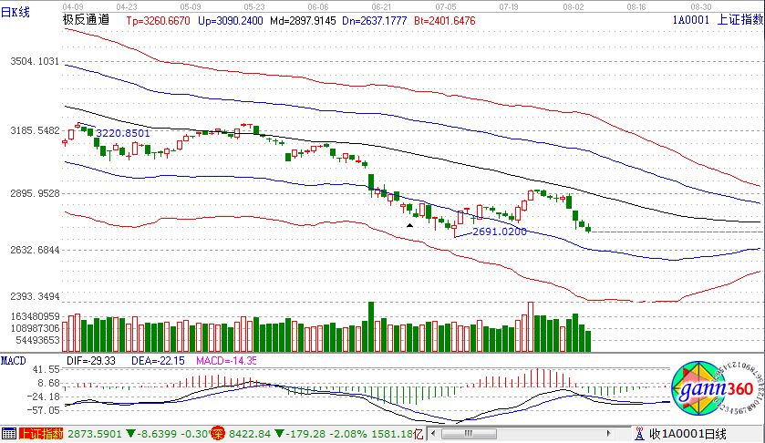 滬指跌1.29%,報2705點;深成指跌2.08%,報8422點;創(chuàng)業(yè)板指跌2.75%,報1440點。盤面上看,西安自貿區(qū)、銀行、鈦白粉等少數板塊上漲;草甘膦、禽流感、高送轉、自由貿易港、豬肉、次新股、醫(yī)藥電商等板塊跌幅居前。滬股通凈流入15億,深股通凈流入16億。相應的極反通道指標的支撐壓力提示,如下圖所示: