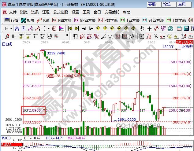 ☆依據(jù)贏家江恩理論系統(tǒng)乾坤K線提示:藍(lán)色K線收盤在短線出局線上方,紅色關(guān)注線2825為阻力,短線謹(jǐn)慎看多、波段看空。