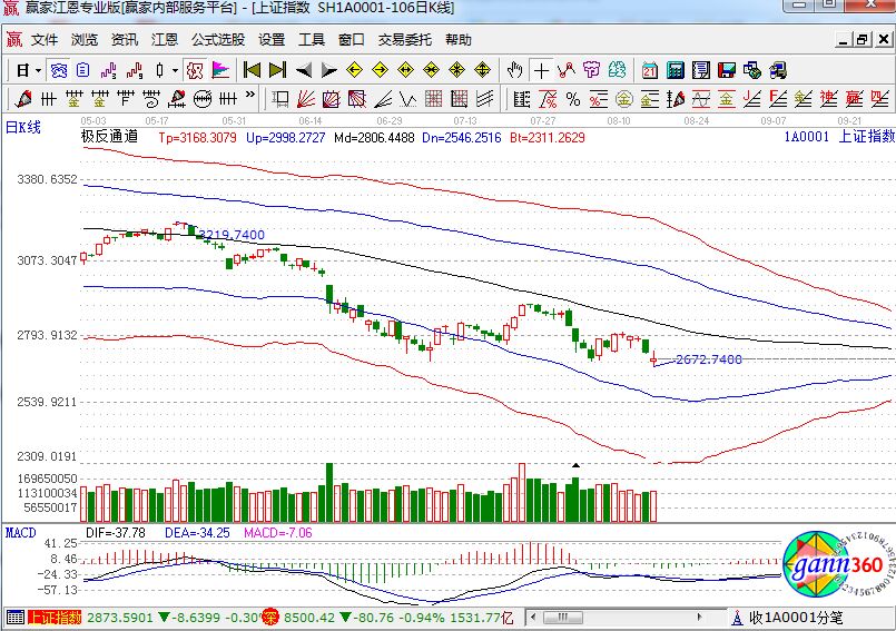 滬指跌0.66%,報2705點;深成指跌0.94%,報8500點;創(chuàng)業(yè)板指跌0.99%,報1463點。從盤面上看,天津自貿(mào)區(qū)、證券、二胎概念、5G、租售同權等板塊漲幅居前;豬肉、高送轉、油改、廣東自貿(mào)區(qū)、海南等板塊跌幅居前。滬股通凈流入15億,深股通凈流入7.7億。相應的極反通道指標的支撐壓力提示,如下圖所示:
