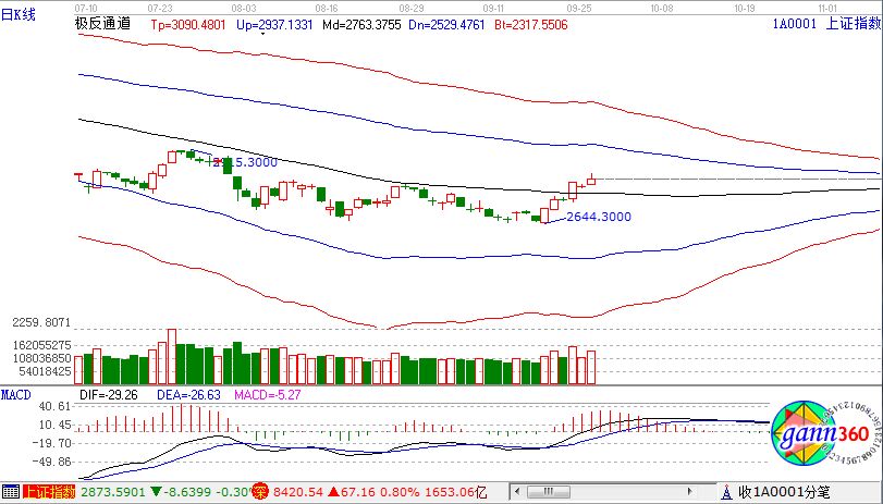 滬指漲0.92%,報(bào)收2806點(diǎn);深成指漲0.80%,報(bào)收8420點(diǎn);創(chuàng)業(yè)板漲1.06%,報(bào)收1420點(diǎn)。從盤面上看,物流、白酒、食品飲料、醫(yī)藥商業(yè)、油改、醫(yī)療器械等板塊上漲;種植業(yè)、氟化工、足球概念、互聯(lián)網(wǎng)彩票、鈦白粉、知識(shí)產(chǎn)權(quán)保護(hù)、軍工等板塊跌幅居前。滬股通凈流入15億,深股通凈流入6億。相應(yīng)的極反通道指標(biāo)的支撐壓力提示,如下圖所示: