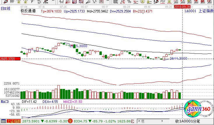 滬指跌0.54%,報(bào)收2791點(diǎn);深成指跌1.02%,報(bào)收8334點(diǎn);創(chuàng)業(yè)板跌1.44%,報(bào)收1400點(diǎn)。從盤面上看,草甘膦、鈦白粉、農(nóng)機(jī)、石油開采等板塊上漲;北汽新能源、次新股、通信設(shè)備、5G、消費(fèi)電子、軍工等板塊跌幅居前。滬股通凈流入27億,深股通凈流入3.9億。相應(yīng)的極反通道指標(biāo)的支撐壓力提示,如下圖所示: