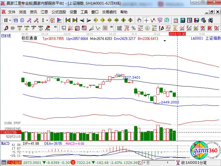 滬指全天再現(xiàn)單邊下挫走勢,上證50指數(shù)大跌3%,受貴州茅臺業(yè)績不及預期跌停帶動,釀酒、醫(yī)藥、家電等白馬股集體殺跌,今世緣、古井貢酒、海天味業(yè)、水井坊等多只個股跌停,大金融板塊也集體低迷,招商銀行盤中一度大跌7%,大消費集體重挫,對場內(nèi)資金情緒打擊較大。滬指跌2.18%,報收2542點;深成指跌2.43%,報收7322點;創(chuàng)業(yè)板跌1.01%,報收1250點。從盤面上看,白酒、煤炭、自由貿(mào)易港、粵港澳大灣區(qū)、物流、煤化工等板塊領跌。滬股通凈流入27億,深股通凈流入1.7億。相應的極反通道指標的支撐壓力提示,如下圖所示: