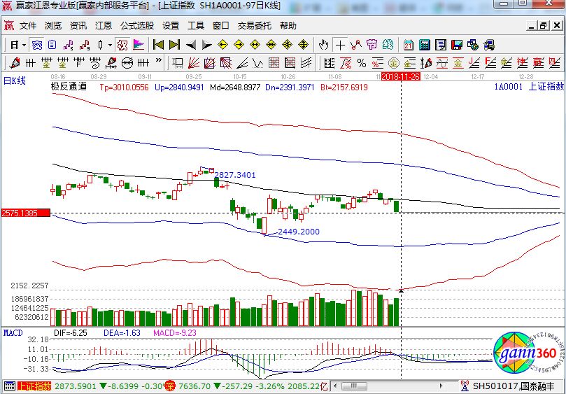 滬深兩市全天一路單邊殺跌,創(chuàng)業(yè)板綜指大跌超4%,個股一片慘綠,創(chuàng)投龍頭光洋股份和市北高新開盤一字封跌停,嚴重打擊市場人氣,創(chuàng)投強勢股集體大跌,民豐特紙、九鼎投資、魯信創(chuàng)投等超30只個股跌停,券商股也表現(xiàn)較弱,長城證券、天風證券均跌超7%,高位市場主線熱點開啟殺跌模式,市場賺錢效應降溫。滬指跌2.49%,報收2579點;深成指跌3.26%,報收7636點;創(chuàng)業(yè)板跌3.34%,報收1308點。滬股通凈流出8000萬,深股通凈流出6.7億。相應的極反通道指標的支撐壓力提示,如下圖所示: