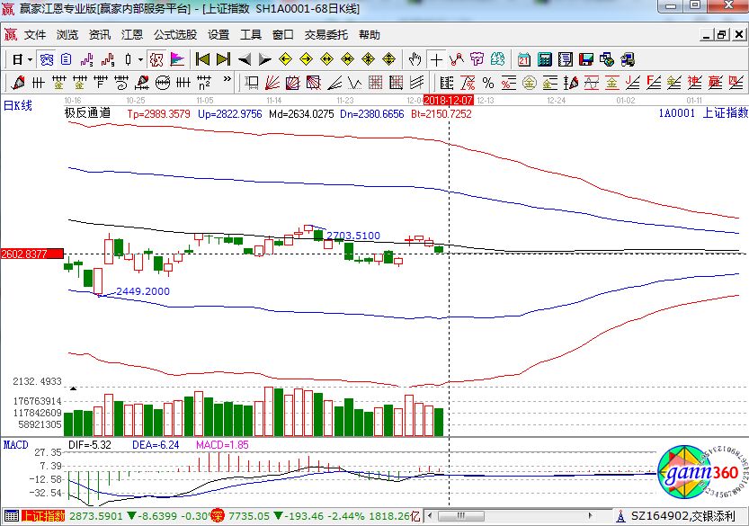 滬指跌1.68%,報收2605點(diǎn);深成指跌2.44%,報收7735點(diǎn);創(chuàng)業(yè)板跌2.61%,報收1345點(diǎn)。盤面上看,高送轉(zhuǎn)、機(jī)場航運(yùn)、知識產(chǎn)權(quán)保護(hù)、5G、生物醫(yī)藥等板塊跌幅居前。滬股通凈流出24億,深股通凈流出15億。相應(yīng)的極反通道指標(biāo)的支撐壓力提示,如下圖所示:
