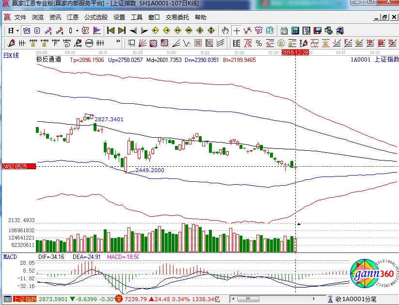 滬指上漲0.44%,報(bào)收2493.9點(diǎn);深成指上漲0.34%,報(bào)收7239.79點(diǎn);創(chuàng)業(yè)板指收漲0.2%,報(bào)收1250.53點(diǎn)。從盤面上看,海南、券商、北斗導(dǎo)航等板塊漲幅居前,次新股、油氣、特高壓等板塊跌幅居前。2018年,滬指從3307點(diǎn)到2493點(diǎn),累計(jì)跌幅近25%;創(chuàng)業(yè)板指從1752點(diǎn)到1250點(diǎn),累計(jì)跌幅近29%。相應(yīng)的極反通道指標(biāo)的支撐壓力提示,如下圖所示:
