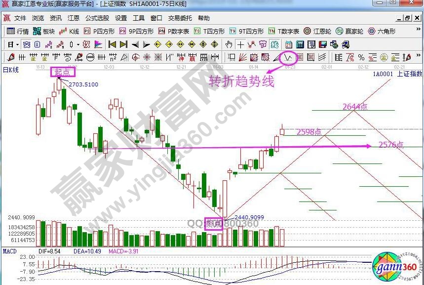 ★依據(jù)贏家江恩理論系統(tǒng)轉(zhuǎn)折趨勢線提示:以2703為起點,2440為終點做轉(zhuǎn)折趨勢線,周一指數(shù)剛好高開在2598后獲得支撐震蕩走高。當(dāng)前2598為支撐,站穩(wěn)則看高壓力2644點,失守則考驗2576點。