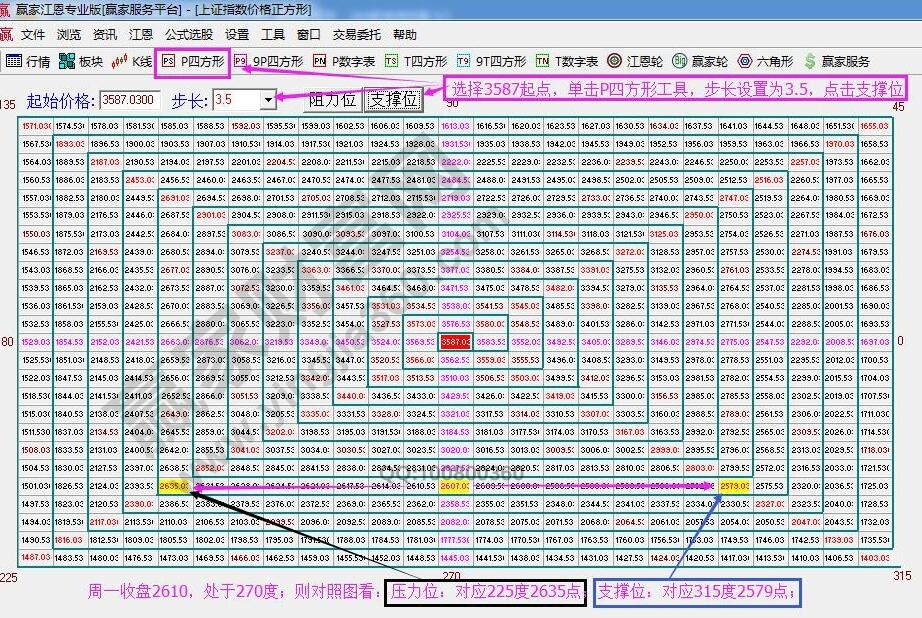 ★依據(jù)贏家江恩理論系統(tǒng)江恩價格四方形提示:以3587為起點,做江恩價格四方形圖。周一收盤2610點處于270度位置,則,周二22日支撐位2579,壓力位2635。