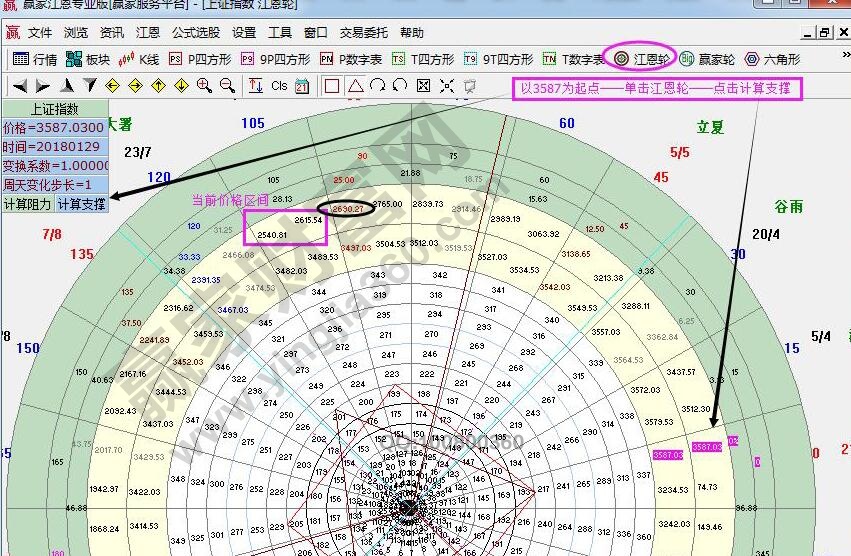 ☆依據(jù)贏家江恩理論系統(tǒng)江恩輪中輪提示:以3587為起點,做江恩輪上輪時空分析圖??臻g上受阻2615壓力點,突破則進(jìn)入下個角度2690;反則,將繼續(xù)確認(rèn)2540支撐。