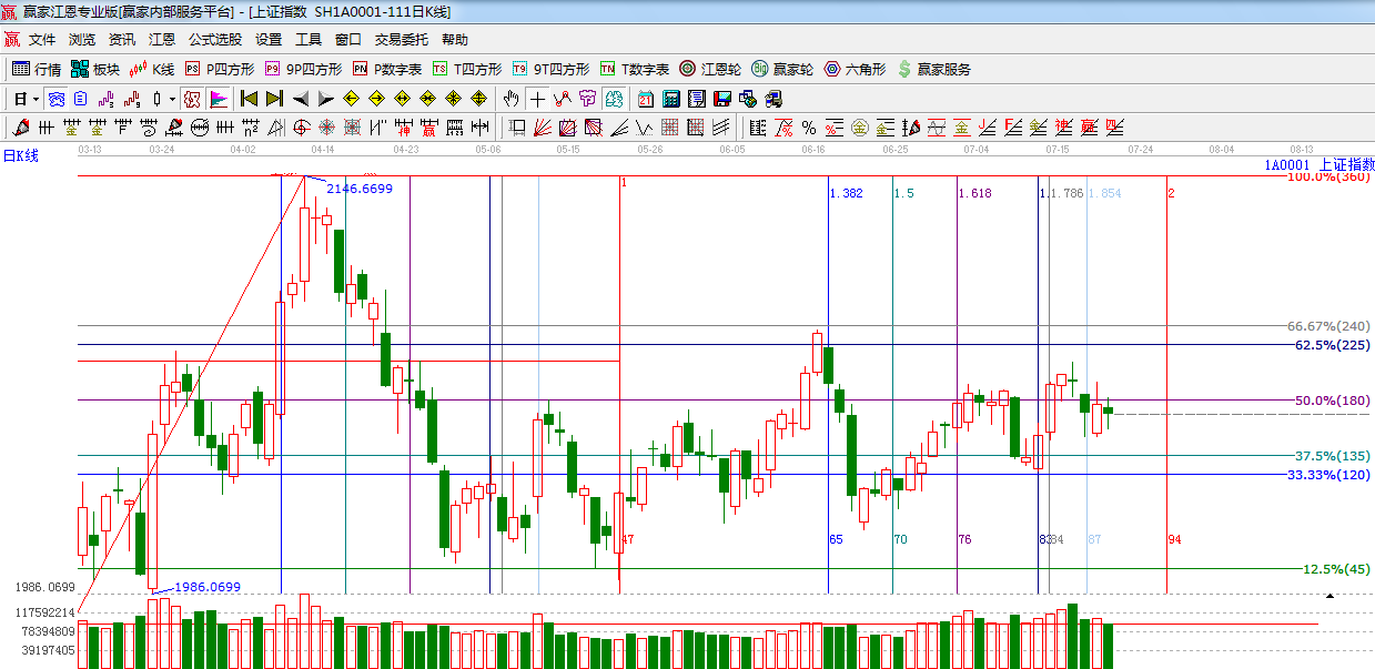☆依據(jù)贏家江恩系統(tǒng)黃金時(shí)間周期線提示:17號(hào)窗口收錘頭線,目前指數(shù)走勢(shì)并不樂觀,下一時(shí)間窗口為7月28日。