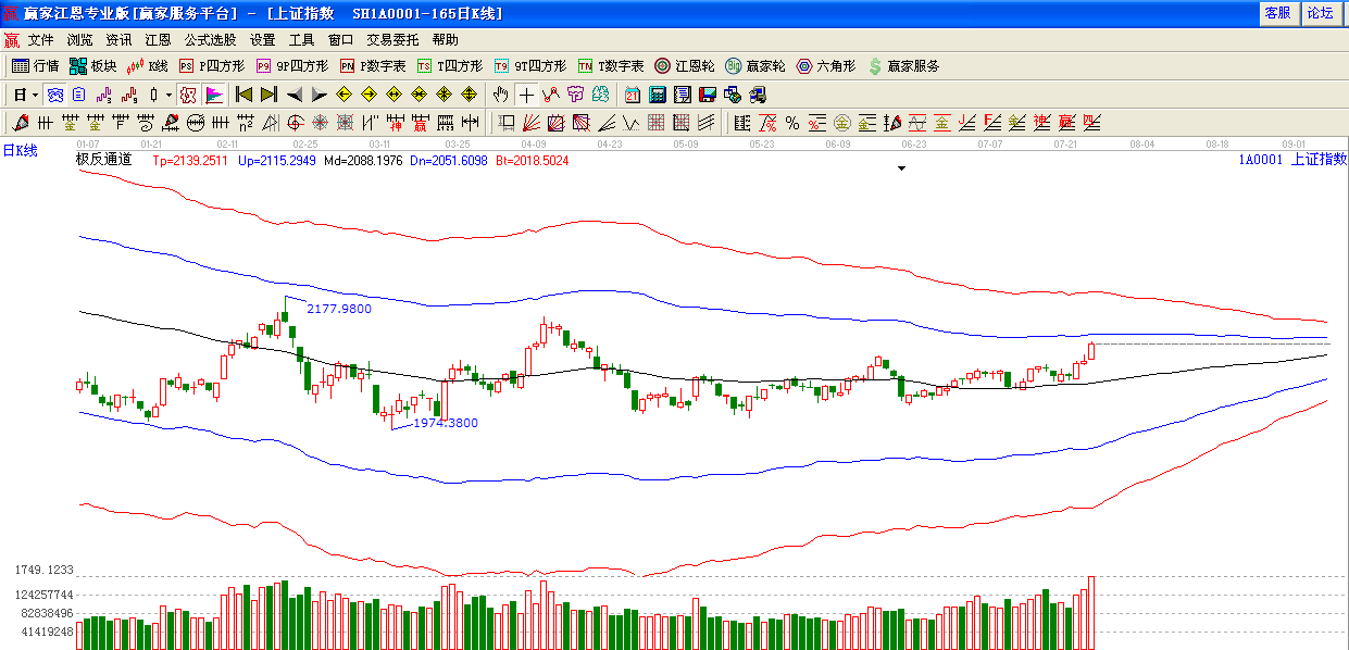 ★依據(jù)贏家江恩系統(tǒng)極反通道提示:在權(quán)重的帶動(dòng)下,攻擊藍(lán)色外軌線,外軌線阻力2120點(diǎn)。