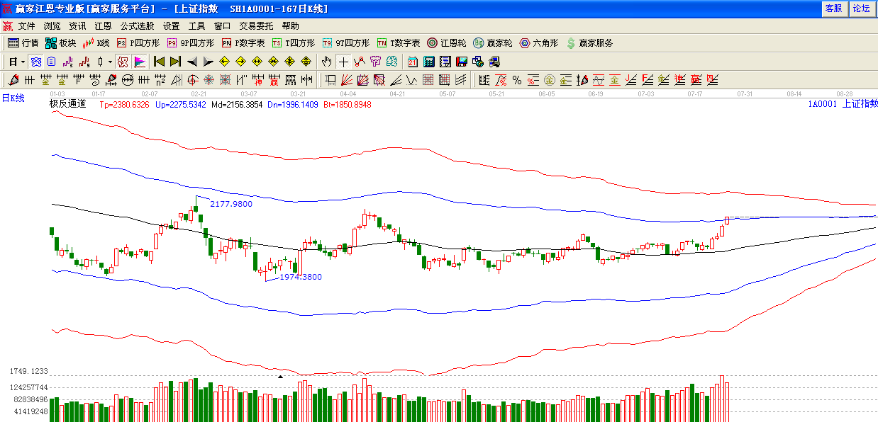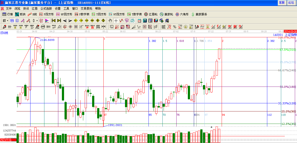 江恩看盤綜述:依據(jù)贏家江恩技術(shù)工具分析得出:在權(quán)重的帶動下,指數(shù)繼續(xù)強勢上攻,突破極反通道藍色外軌線,短期面臨前期頭部2146點阻力,周一留意沖高回落動作,7月28日又是前期提到時間窗口。謹慎留意盤面變化。