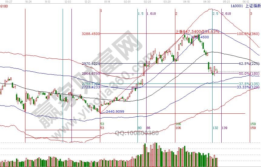 大盤延續(xù)極反通道生命線下弱勢通道運行,按贏家江恩十六字投資真言,時價共振短線反彈信號依然存在,隨著江恩時間窗口臨近,短線又將再度選擇方向,前期的快速下跌,市場需要時間積累能量化解短線壓力,按工具信號開倉的籌碼,要有足夠的耐心和充分的風(fēng)險控制能力,應(yīng)對策略可查看14號大勢分析。15號盤中支撐壓力是180度2928點、315度2944點,盤中支撐0度2860點,本周五17號是5月第二個時間窗口。操作策略,指數(shù)擊破黑色生命線,藍(lán)色下軌線是回撤目標(biāo)位,高風(fēng)險者倉位3-4成,低風(fēng)險者等待中期參考位。