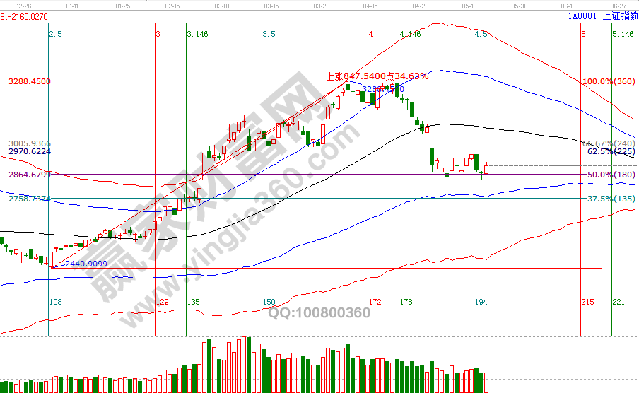 5月10號(hào)、20號(hào),大盤日K線分別回探波段百分比延伸線1倍循環(huán)二分位2834點(diǎn)后止跌企穩(wěn),第一次反彈止步于短周期60分鐘生命線位置,本次關(guān)注此線能否突破站穩(wěn)(學(xué)員通過(guò)工具查看關(guān)鍵位),站上此線則指數(shù)日k線回補(bǔ)下方缺口的概率將降低(但不排除),23號(hào)短周期時(shí)間后會(huì)再次進(jìn)行評(píng)估。投資者應(yīng)好好把握當(dāng)前機(jī)會(huì),待整固結(jié)束后市場(chǎng)必會(huì)有一波反彈到生命線的機(jī)會(huì)。本周短周期重要時(shí)間窗口是23號(hào),日線時(shí)間窗口是28(29)號(hào)。22號(hào)盤中壓力是180度2928點(diǎn)、225度2944點(diǎn),盤中支撐是90度2894。操作策略,指數(shù)擊破黑色生命線進(jìn)入弱勢(shì)區(qū)域,高風(fēng)險(xiǎn)者倉(cāng)3-5成,低風(fēng)險(xiǎn)者本周進(jìn)入備戰(zhàn)期擇機(jī)參與。