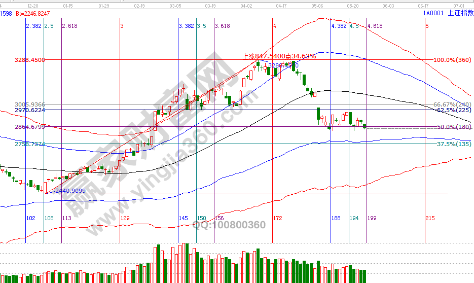 時(shí)間是決定市場(chǎng)走勢(shì)最重要因素?;仡欄A家江恩系統(tǒng)工具點(diǎn)評(píng)時(shí)間窗口,4月22號(hào)指出降低倉位至3成,4月25號(hào)提示低風(fēng)險(xiǎn)者空倉休息,5月9號(hào)時(shí)間窗口提示短線高風(fēng)險(xiǎn)可以開倉,17號(hào)時(shí)間窗口前(15、16號(hào))提示獲利出局,這兩天提示短線周期時(shí)間窗口(23號(hào))將確認(rèn)一關(guān)鍵位,從收盤數(shù)據(jù)看,市場(chǎng)明日失守波段百分比180度2834點(diǎn),價(jià)格拐點(diǎn)將是5月第三個(gè)日線時(shí)間窗口28、29號(hào),在此時(shí)間段,無技術(shù)、無紀(jì)律者休息不要再被收割了,你是否將1季度的收益已回吐市場(chǎng)?要改變虧損的現(xiàn)狀,從擁有一套完整交易體系開始。江恩理論研究時(shí)空運(yùn)行,通過工具預(yù)判出時(shí)間后,空間上則看趨勢(shì)工具極反通道藍(lán)色下軌線(VIP學(xué)員查看相應(yīng)位置)。日線藍(lán)色下軌線站穩(wěn)將是又一次操作機(jī)會(huì),待整固結(jié)束后市場(chǎng)必會(huì)有一波反彈到生命線行情,而這機(jī)會(huì)是留給有準(zhǔn)備的交易者。24號(hào)盤中壓力是315度2844點(diǎn)、0度2860點(diǎn),盤中支撐是225度2815、180度2800點(diǎn)。操作策略,指數(shù)擊破黑色生命線進(jìn)入弱勢(shì)區(qū)域,高風(fēng)險(xiǎn)者倉3-4成,低風(fēng)險(xiǎn)者本周進(jìn)入備戰(zhàn)期。
