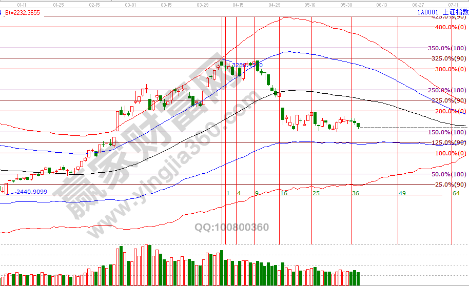 6月第一個(gè)時(shí)間窗口4、5號(hào),日K線再探江恩輪中輪(2847點(diǎn))、江恩箱2*1線(2850點(diǎn))位置,今天最低點(diǎn)(2851點(diǎn))同江恩箱所提示的支撐位僅1點(diǎn)之差,同時(shí)波段百分比延伸線1倍循環(huán)180度2834點(diǎn),多個(gè)價(jià)格工具共振區(qū),綜合結(jié)論是2840附近為強(qiáng)支撐,5月份三次下探后均展開(kāi)不同程度的反彈。目前時(shí)間窗口繼續(xù)關(guān)注2840附近支撐,此線如失守則調(diào)整短線應(yīng)對(duì)策略,下方為極反通道藍(lán)色下軌線。贏家江恩交易體系中強(qiáng)調(diào),只在關(guān)鍵位進(jìn)行交易,如4月22號(hào)失守極反通道上軌線減倉(cāng),4月25號(hào)再度減倉(cāng)或空倉(cāng),5月9號(hào)參與反彈等等。明天將揭曉拐點(diǎn)是否形成,6月第一個(gè)時(shí)間窗口如產(chǎn)生不了轉(zhuǎn)折,則下個(gè)時(shí)間窗口13號(hào)是日、周線共振,級(jí)別要大于近期時(shí)間窗口。5號(hào)盤(pán)中壓力是45度2877點(diǎn)、90度2894點(diǎn),盤(pán)中支撐是315度2844、270度2829點(diǎn)。操作策略,指數(shù)擊破黑色生命線進(jìn)入弱勢(shì)區(qū)域,整體持倉(cāng)保持在3-4成,做到進(jìn)可攻退可守。