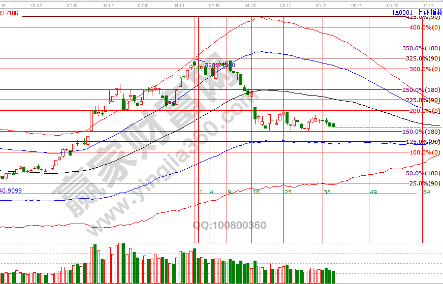 大盤時間窗口未給出明確的方向選擇,延續(xù)空間分析波段百分比延伸線1倍循環(huán)180度2834點與2倍零度位2966點區(qū)間震蕩,因端午假期,本周僅剩一個交易日,如明天市場延續(xù)震蕩格局,則下周將是周線、日線時間窗口期,維持1個月的橫盤后無論是上下市場都會給一個方向。隨著時間的推移,市場人氣情緒必會有一次爆發(fā),從技術角度研究,百分比2834-2780(極反通道藍色下軌線)這里出現(xiàn)轉(zhuǎn)強信號則能帶動場外資金入場。當前贏家江恩給出的策略為,高風險者在2840附近可以參與,運用區(qū)間交易法;低風險者可以等出現(xiàn)中陽或指數(shù)靠近藍色下軌線附近開倉。6號盤中壓力是45度2877點、90度2894點,盤中支撐是315度2844、270度2829點。操作策略,指數(shù)擊破黑色生命線進入弱勢區(qū)域,整體持倉保持在3-4成,做到進可攻退可守。
