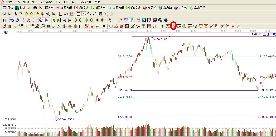 咨詢:13333833889輪中輪在江恩理論中可以說占據(jù)者舉足輕重的地位,其重要的點位往往會發(fā)生重要的轉(zhuǎn)折,而江恩價格百分比跟輪中輪有著較為密切的關(guān)系,他們之間有著什么樣的關(guān)系,輪中輪的點位是如何計算出來的?我們以大盤2009-08-04日3478.01點為高點來解說輪中輪跟江恩價格百分比的共同之處跟計算方法: