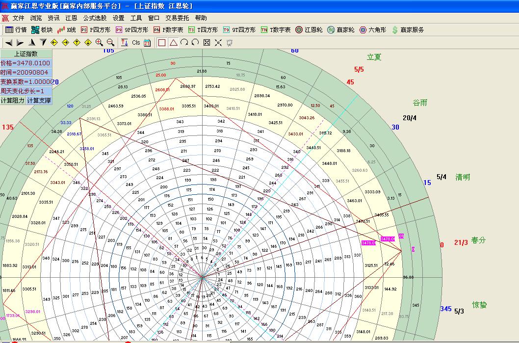 然后我們用江恩價格百分比在大盤2009-08-04日3478.01點作圖計算支撐位置。用心的朋友不難發(fā)現(xiàn)其重要的秘密,那就是他們都有45度【12.5%】90度【25%】120度【33.33】180度【50%】那么他們的點位是如何計算出來的呢?這些點位都跟3478.01點都有這重要行的關(guān)系;45度位置如何計算出來的呢?