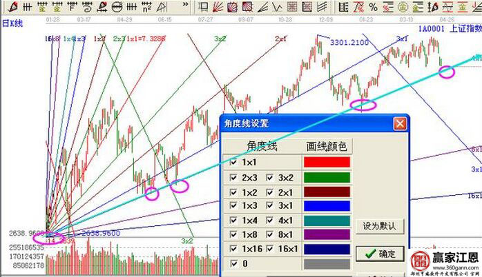 江恩角度線是分上升角度線和下降角度線的,在以每天波動(dòng)幾個(gè)點(diǎn)的上漲速度延伸的,其中1*1角度線是非常重要的,因?yàn)檫@里是多空強(qiáng)勢(shì)的分界線,當(dāng)然除此之外還有的1*2、1*3、1*4、1*8、1*16、2*3、3*2、2*1、3*1、4*1、8*1、16*1、角度線,把市場(chǎng)分割了13個(gè)區(qū)域.而角度線在交易中有支撐壓力作用。我們來(lái)看下面的上證指數(shù)圖。