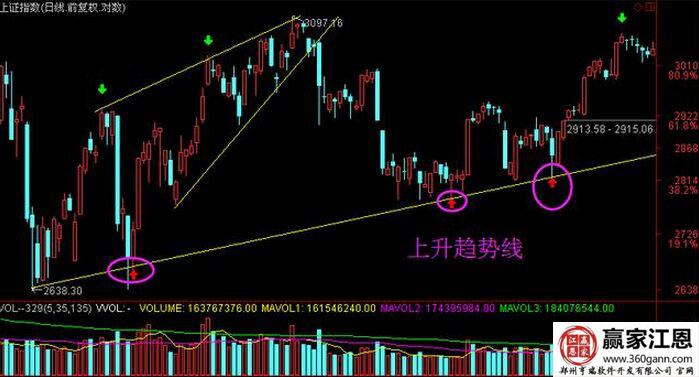 上圖是本人在2017年1月17日做所的一張上證指數(shù)圖,顯然上面就是一個(gè)非常明顯的上升趨勢(shì)線,就是以每一次的低點(diǎn)的連線來(lái)畫線,像上面那樣就是上升趨勢(shì)線,當(dāng)然相反的下降趨勢(shì)線就是以反彈的高點(diǎn)連線來(lái)做線,如果股價(jià)突破下降趨勢(shì)線,那么即意味著股價(jià)將會(huì)反轉(zhuǎn)。所以趨勢(shì)線就是相鄰兩個(gè)低點(diǎn)或者高點(diǎn)所構(gòu)成的直線射線延伸。顯然是不同與上面所講的江恩角度線的。