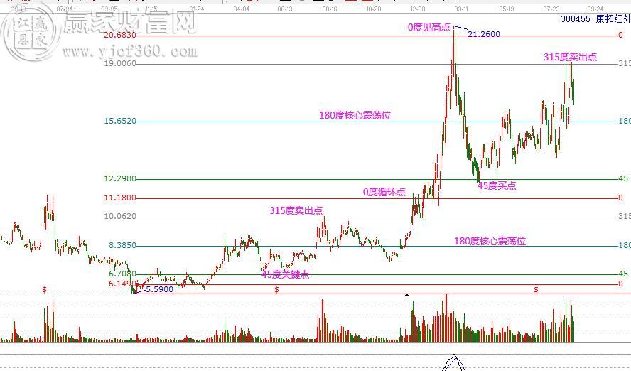 圖形解析:康拓紅外,階段低點(diǎn)5.59,以此價(jià)格為起點(diǎn),作出K線價(jià)格四方形,同時(shí),步長(zhǎng)設(shè)定為起點(diǎn)5.59的0.1倍,即0.559;結(jié)合市場(chǎng)具體的走勢(shì),保留關(guān)鍵的0度,45度,180度及315度。我們可以看到在不同的循環(huán)中,45度的兩波啟動(dòng),同時(shí)180度的震蕩走勢(shì),以及315度的關(guān)鍵賣出點(diǎn),以及最重要的0度循環(huán)位的頂點(diǎn)。