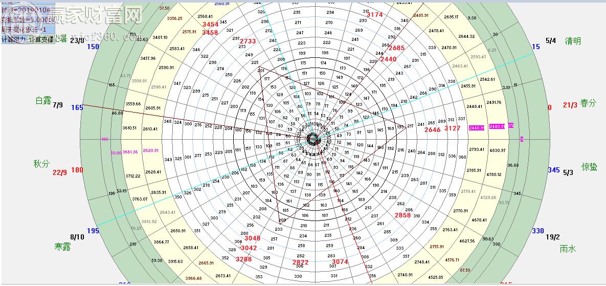 贏家江恩在其中更是融合了中國二十四節(jié)氣及天干地支思想。其結(jié)構(gòu)從外圈到內(nèi)圈,依次是24節(jié)氣——自然日時間——度數(shù)(春分對應0度)——價格度數(shù)(起點價格是0度)——比例(起點價格的重要比例)——支撐或阻力(黃色的兩圈,一圈為百分比,一圈為輪子循環(huán)結(jié)構(gòu)值。)——輪子內(nèi)部數(shù)字排列(即1-360)。