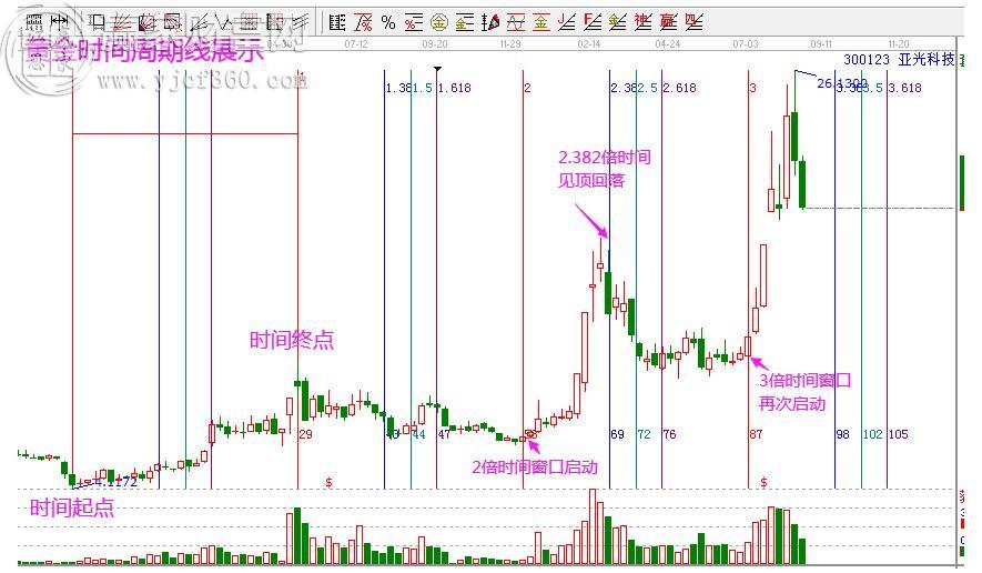 圖形解析:亞光科技,以2018年10月19日低點(diǎn)到2019年5月17日高點(diǎn)的周線為起始周期。同時(shí)保留最關(guān)鍵的0.382、0.5、0.618分割位。可以看到,股價(jià)在2倍時(shí)間窗口啟動(dòng)拉升,在2.382倍時(shí)間窗口拐點(diǎn)向下,3倍時(shí)間窗口再次啟動(dòng)趨勢(shì)拉升行情。兩波大幅度上漲行情,都是出現(xiàn)在倍數(shù)位,可通過(guò)該工具完美把握。因此,接下來(lái)的4倍時(shí)間窗口就尤其關(guān)鍵了。