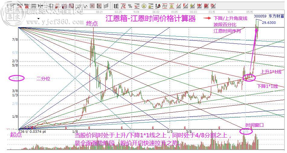 圖形解析:東方財富,以2012年12月7日低點(diǎn)和2015年6月5日高點(diǎn)為起始波段,時間周期為121周,根據(jù)市場具體的走勢,步長設(shè)定為121*6=726周,得出如上的分析圖。可以看到市場價格在周期內(nèi)的波動情況,其中最關(guān)鍵的角度線的1*1線都是重要的阻力和支撐點(diǎn),以及價格的4/8分割位,而當(dāng)股價同時站上了兩條角度線的1*1線和價格的4/8分割位,就意味著市場趨勢非常強(qiáng)勢。因而,當(dāng)股價突破了這幾個關(guān)鍵的位置后,4/8分割時間序列窗口開啟主升。