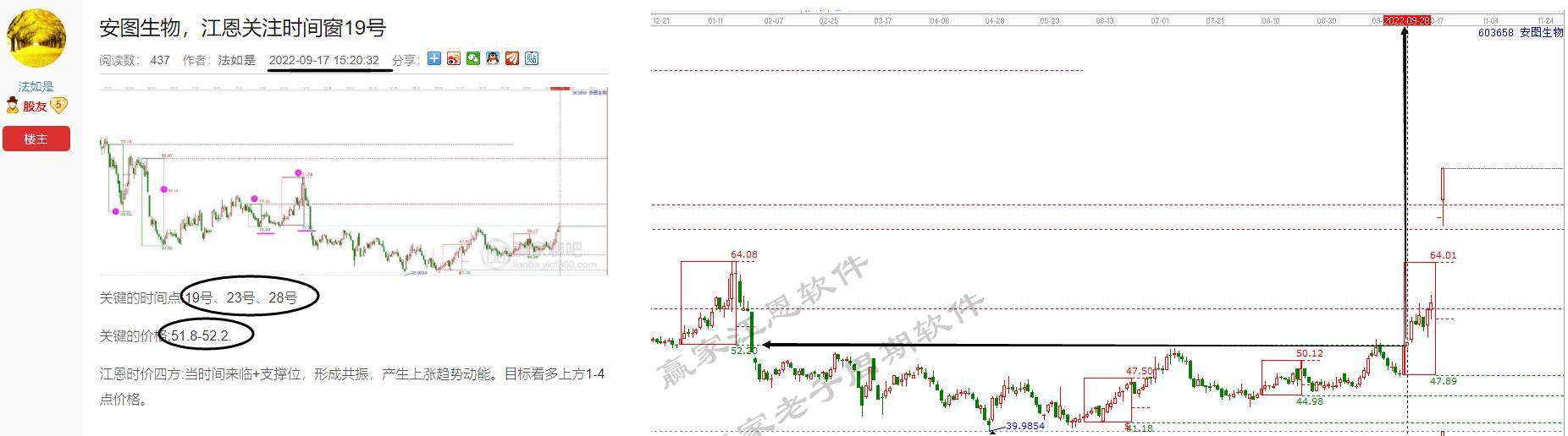 安圖生物依據(jù)老子十二宮工具時(shí)價(jià)信號(hào),17號(hào) 選出,時(shí)間窗呈現(xiàn)三個(gè)19號(hào),23號(hào),28號(hào)。價(jià)格預(yù)測51.8-52.2。