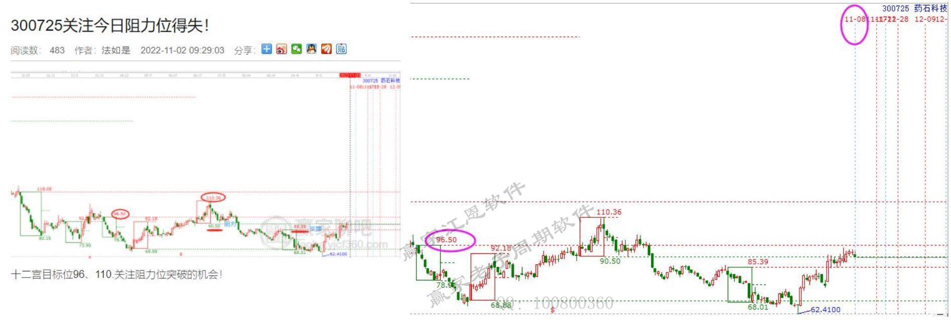 藥石科技,今日已經(jīng)到達(dá)預(yù)測的第一目標(biāo)位。時(shí)間窗+預(yù)測點(diǎn)位96.5元,工具信號止盈!短短幾天又是一個漲幅空間6%!規(guī)則很清晰:時(shí)間+支撐是關(guān)注,時(shí)間+阻力是出局。每條線互為支撐和阻力,線上支撐,線下阻力。