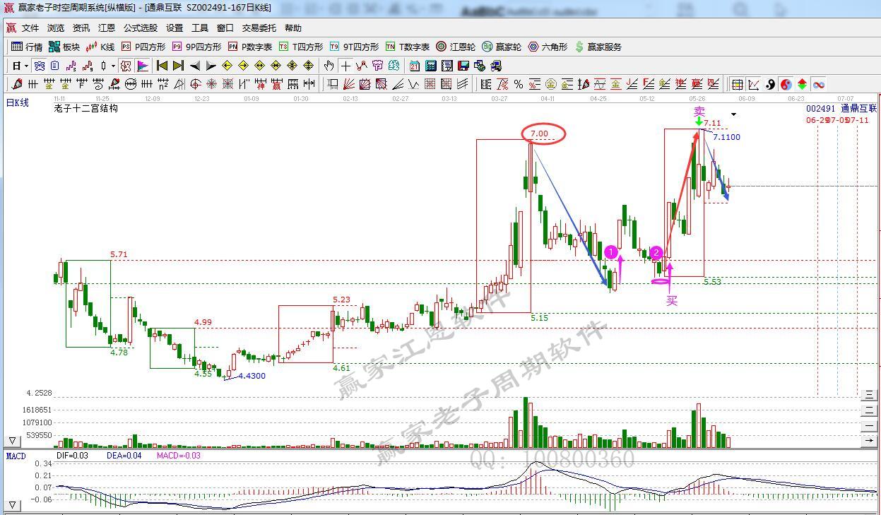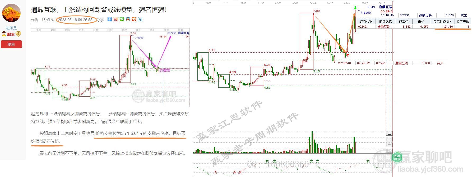 案例通鼎互聯(lián)為例,自5月18日早盤前運用贏家十二宮解析并持有,預(yù)期當(dāng)前支撐位5.71-5.61元,目標(biāo)位至7元。最終走出,歷時7天,抵達(dá)江恩分析法預(yù)測的特定波動空間價格7元。盈虧比例快速達(dá)到19.18%。那么如何站在實戰(zhàn)角度預(yù)測如何歸于實盤交易呢?