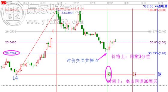 如圖,以300153科泰電源為例。首先來(lái)看價(jià)格。當(dāng)前走勢(shì)處于14-32.08這個(gè)上漲波段的回撤空間內(nèi),則我們選取波段百分比工具來(lái)作圖。以14為起點(diǎn),32.08為終點(diǎn)作圖,可以得到:自32.08展開(kāi)的回調(diào),剛好回落到120度3分位附近,20元附近為價(jià)格上的重要支撐位。接著,來(lái)看時(shí)間。利用自定義周天循環(huán)線,以本輪高點(diǎn)32.08這一天為起點(diǎn),可以看到本輪調(diào)整已經(jīng)運(yùn)行了30交易日,符合江恩時(shí)間法則。價(jià)格上回撤3分位,時(shí)間上滿(mǎn)足回調(diào)30周天法則,橫著的價(jià)格線和豎著的時(shí)間線交叉形成共振點(diǎn),直接轉(zhuǎn)勢(shì)往上。