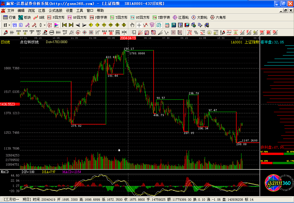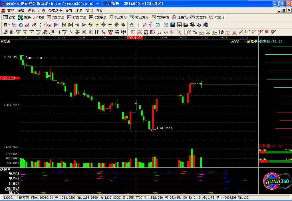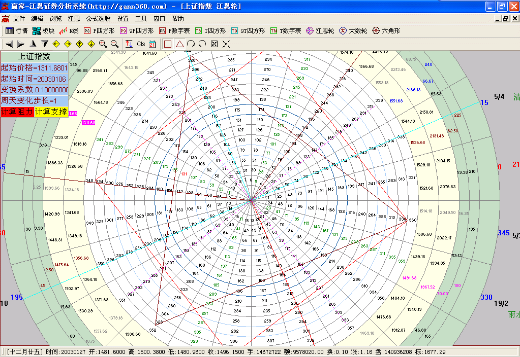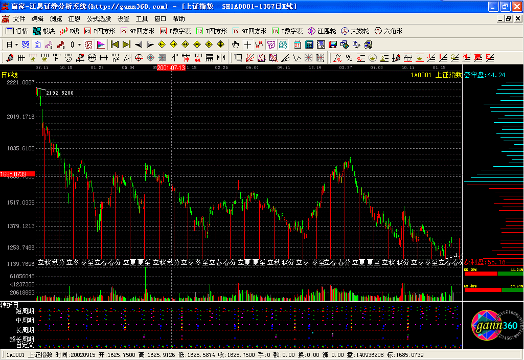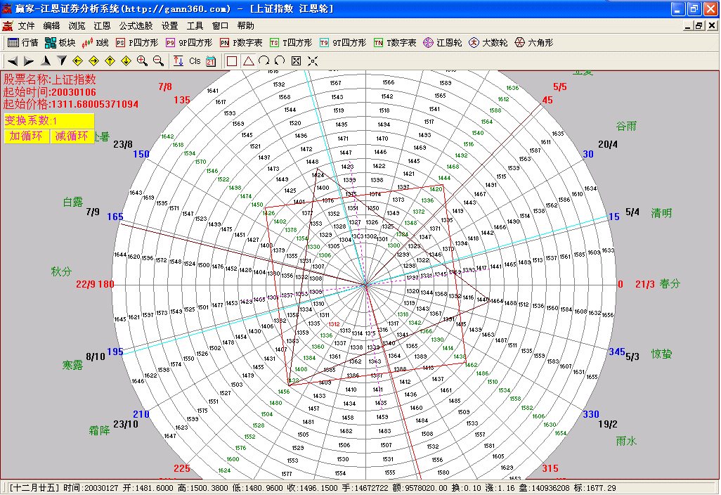 本軟件除實(shí)現(xiàn)了江恩的經(jīng)典判市工具:包括江恩輪、價(jià)格正方形、九格價(jià)格正方形、時(shí)間正方形、九格時(shí)間正方形、六角形、角度線、江恩計(jì)算器、時(shí)間及價(jià)格循環(huán)線、時(shí)間周期線、江恩價(jià)格回調(diào)帶外,增加了百分比線、百分比延伸線、黃金延伸線、黃金回調(diào)帶、黃金分割阻力支撐線、k線價(jià)格四方形、自定義時(shí)間價(jià)格計(jì)算器、黃金時(shí)間周期線、螺旋時(shí)間周期線、自定義周天江恩時(shí)間循環(huán)線、平方時(shí)間循環(huán)線、三點(diǎn)周期線、螺旋歷法時(shí)間循環(huán)線、k線時(shí)間論中論(變盤點(diǎn))、k線時(shí)間四方形(變盤點(diǎn))、時(shí)間轉(zhuǎn)折日提示、24節(jié)氣轉(zhuǎn)折日提示、神奇周期線、神奇價(jià)格線、贏家周期線、自定義時(shí)間周期線、趨勢轉(zhuǎn)折線、點(diǎn)位跟蹤轉(zhuǎn)折線。