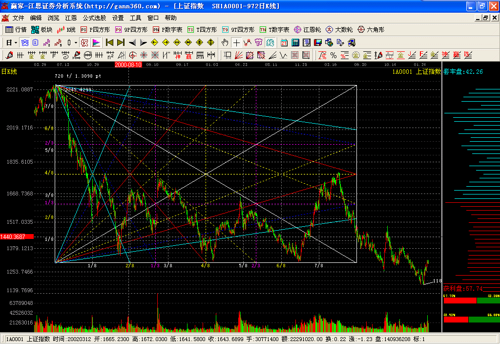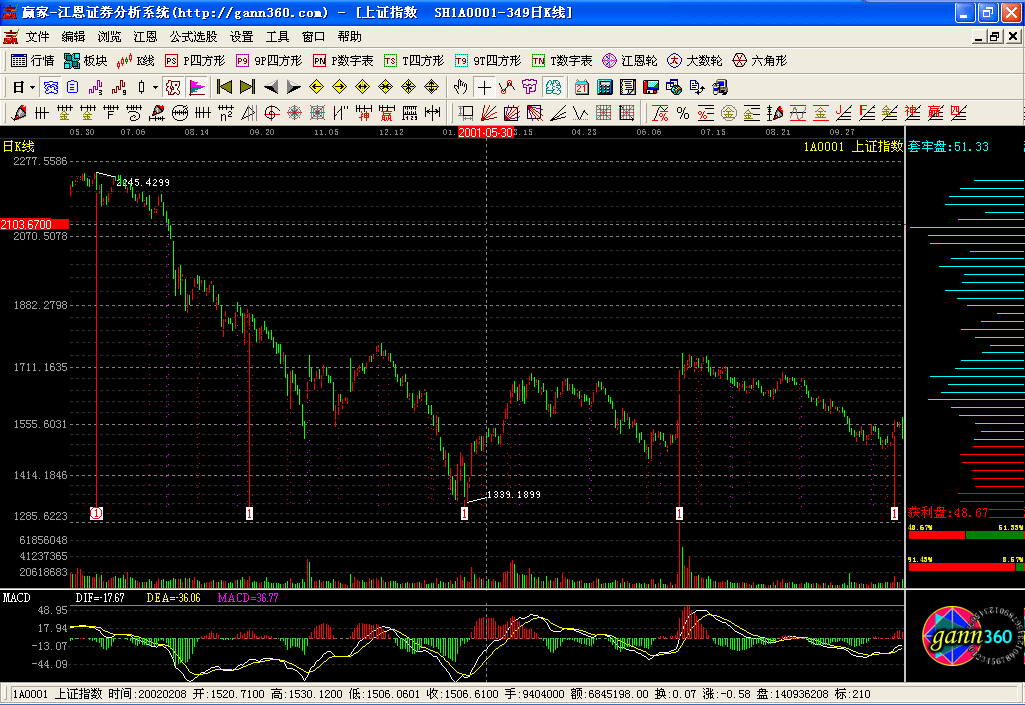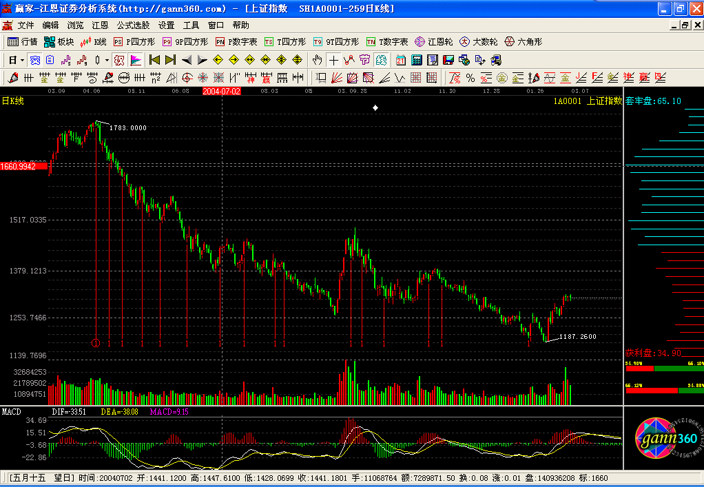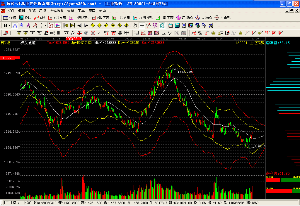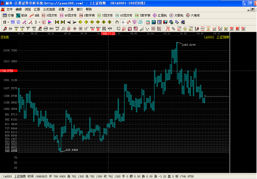 本軟件除實(shí)現(xiàn)了江恩的經(jīng)典判市工具:包括江恩輪、價(jià)格正方形、九格價(jià)格正方形、時(shí)間正方形、九格時(shí)間正方形、六角形、角度線、江恩計(jì)算器、時(shí)間及價(jià)格循環(huán)線、時(shí)間周期線、江恩價(jià)格回調(diào)帶外,增加了百分比線、百分比延伸線、黃金延伸線、黃金回調(diào)帶、黃金分割阻力支撐線、k線價(jià)格四方形、自定義時(shí)間價(jià)格計(jì)算器、黃金時(shí)間周期線、螺旋時(shí)間周期線、自定義周天江恩時(shí)間循環(huán)線、平方時(shí)間循環(huán)線、三點(diǎn)周期線、螺旋歷法時(shí)間循環(huán)線、k線時(shí)間論中論(變盤點(diǎn))、k線時(shí)間四方形(變盤點(diǎn))、時(shí)間轉(zhuǎn)折日提示、24節(jié)氣轉(zhuǎn)折日提示、神奇周期線、神奇價(jià)格線、贏家周期線、自定義時(shí)間周期線、趨勢轉(zhuǎn)折線、點(diǎn)位跟蹤轉(zhuǎn)折線。