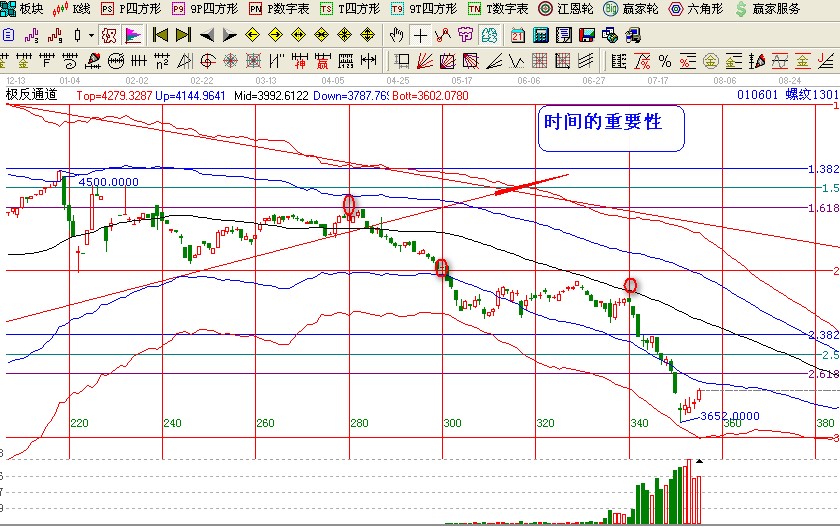 我們用這2個高低點做一個時間的延伸,我們會神奇的發(fā)現(xiàn)2011年6月9日螺紋鋼出現(xiàn)了一波快速殺跌,2011年8月4日再次出現(xiàn)了一波快速殺跌,2011年9月1日不久也是一波快速的殺跌等等。。。最近的一次殺跌2012年7月6日再次上演了快速殺跌的一次動能。