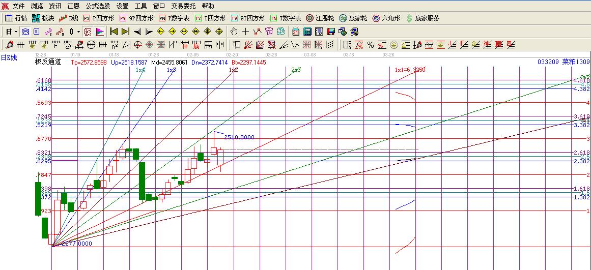 菜粕1309合約一直沿著角度線1*1線的位置穩(wěn)步上行未來也就是20130220日就是重要的時間拐點的位置,時間來臨前逢低做多為主。