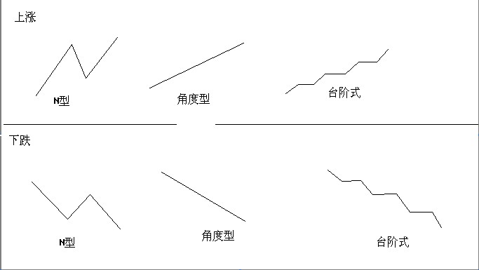市場(chǎng)上漲與下跌的方式有固定的模式,如N字型、角度型、臺(tái)階式、傾斜箱體式,上漲與下跌的運(yùn)行模式正好相反,無規(guī)律的K線圖形走勢(shì)反應(yīng)出的是無莊或莊家太惡,這類個(gè)股不是大眾投資者所參與的標(biāo)的,如下圖是市場(chǎng)中常見的運(yùn)行結(jié)構(gòu),用直線畫出其輪廓,其內(nèi)在運(yùn)行K線則有K線組合、K線形態(tài)構(gòu)成;