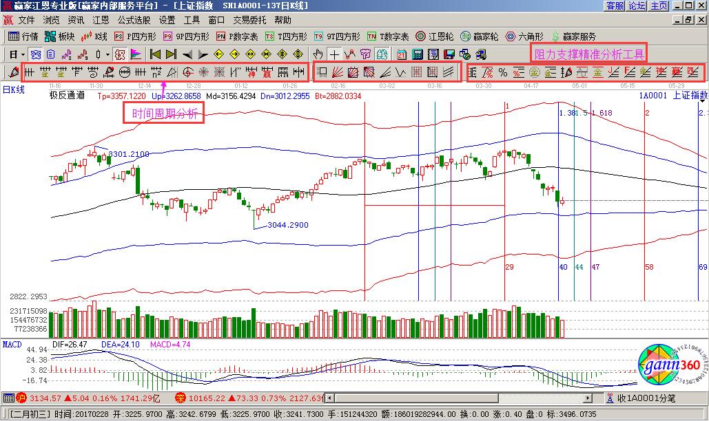 贏家江恩軟件最核心的分析是江恩的時間周期分析和阻力支撐分析(如下圖軟件界面圖形和兩大核心工具分布圖形)。只要掌握了這兩者的分析,也就是掌握了軟件分析的核心。下面逐步告訴新手來如何學習贏家江恩軟件。