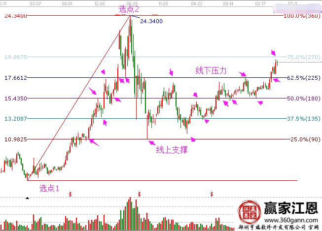 我們以上述股票為例,江恩波段百分比需要作圖:選取一個高點和低點作圖。這個高點和低點是歷史上的低點和高點,對于后市的具有分析的點位。圖中選取了這波到達24.34位置的開始的低點,以這波行情最高點24.34位置作為第二選點。畫法很簡單,選中軟件圖標中的圖標,點擊凹陷,表示選中;接下來鼠標放到低點下方,按住鍵盤上的shift鍵(可以精準定位低點位置),定位后松開此鍵,右手按住鼠標左鍵不松開,拖動到高點(此時也要像低點一樣精準對準高點)選好點好松開鼠標就可以完成上面的作圖。這個工具的用法一樣是線上支撐,線下阻力。可以看到圖中高點和低點都出現(xiàn)分割線上。