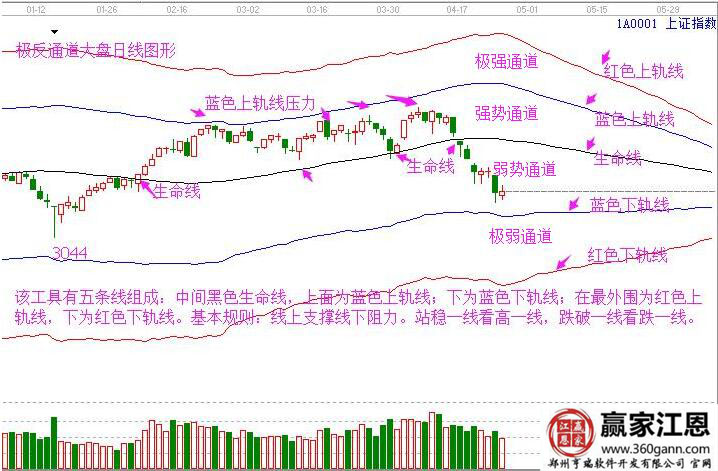 對于極反通道的學習,先從工具的名稱和原理開始。名稱為極反通道,原理為物極必反。關于五條線和四個通道的名稱我在圖中已經(jīng)都標出來了,大家對照記住就可以。剩下來就是最重要的用法了。極反通道是軟件中根據(jù)江恩分割比例為了使用編寫出來的趨勢工具,是軟件中最簡單使用最高的分析工具。無論是判斷大盤還是個股趨勢和買賣點都有重要的分析作用。其中生命線為趨勢強弱的分界點,在生命線上為強勢,可以放心操作;在生命線下為弱勢,輕倉操作。
