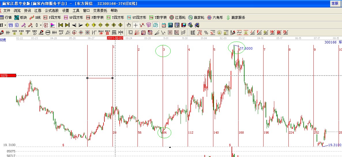 我們以創(chuàng)業(yè)板300166(東方國信)做分析,此股2011年6月20號創(chuàng)出階段性低點(diǎn)后展開60度左右的上攻,所用時間28天,漲幅31%,隨后轉(zhuǎn)為調(diào)整,然后整理的時間正好到84天,是原上漲周期的第3個循環(huán)的結(jié)束點(diǎn)上,然后股價再次上漲也正好用了三個循環(huán),這也整理時間的魅力;