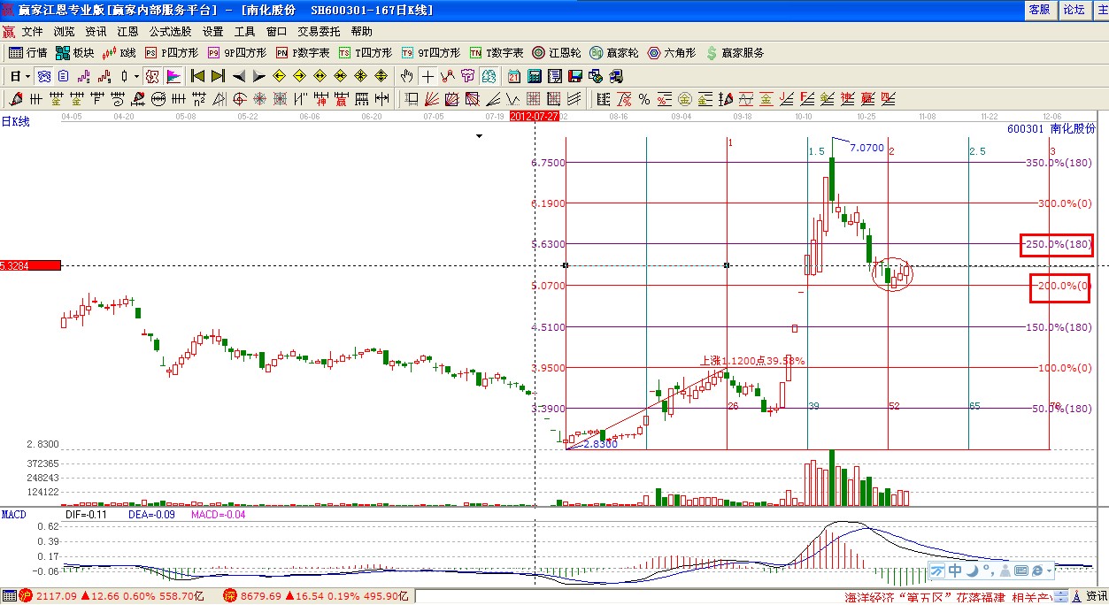 贏家江恩系統(tǒng)波段百分比工具分析:以2012年8月3號2.83為起點,9月13號3.95為終點分析做圖如下,5.07元是價格第二個循環(huán)的開始位置,股價上攻回落到此位置轉(zhuǎn)為震蕩;