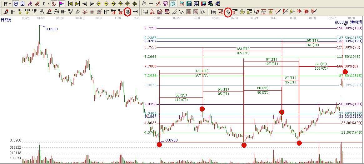600336 澳柯瑪在2010-11-29日高點9.90位置跌至2012-01-06日3.89見底展開了一波為期68交易日的震蕩上行,在2012-04-27日高點5.55位置展開了一個為期64天的下跌【跟第一波上漲67天誤差了3天】再其2012-07-31日最低點也是3.89最低點跟上一次的低點一分不差,時間跟價格的完美演繹,就構成了雙底絕佳的介入位置。這里啟動見高點運行了60交易日也就是2012-10-29日最高5.47這一波的高點距離2012-04-27日高點5.55高點僅僅誤差了0.08當其經行第3次回調的時候調整的時間僅僅用了27個交易日【不到其上漲的180度時間】最為中國藥的是這一波的調整深度最低下探至2012-12-04日低點4.03較為明顯的比前2次底部抬高,這里就構成的3重底的一個絕佳的買點。而這個3.89的3重底的買點突破價格的180度就開始了快速拉升,目前處于270度位置6.8075上方。上方短期壓力是315度位置7.29的壓力,最為重要的就是其0度位置7.78的位置。這里是一個價格循環(huán)的開始也是一個循環(huán)的結束.時間結構通過研究歷史上重要的低點高點位置可以知道重要的時間周期是1-2個低點的時間周期間隔了131交易日,而2-3這個時間低點是其87交易日而AB高高點運行了123個交易日。目前B點高點到至今是其95個交易日完全跨越了87時間周期,那么重要的高點區(qū)域就在其123時間周期或者是100周期都是需要注意的時間拐點...