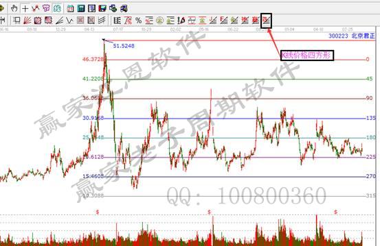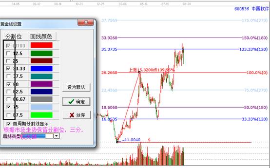 礎(chǔ)上,將倍數(shù)關(guān)系和形態(tài)空間循環(huán)用圖形展現(xiàn)出來(lái)。選擇一個(gè)歷史的波段作為起始因子,對(duì)該波段漲幅進(jìn)行8分和3分。并據(jù)此作為第一個(gè)循環(huán),之后的走勢(shì)按該循環(huán)的分割比例直接往后進(jìn)行延伸,所得到的位置往往成為未來(lái)重要的支撐和壓力。