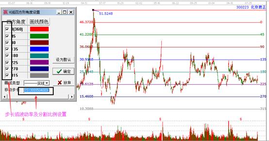 (二)研發(fā)原理:江恩波動(dòng)法則、江恩圓及分割。該工具是將經(jīng)典的江恩螺旋四方轉(zhuǎn)化到K線圖形中,以便用戶更直觀的結(jié)合具體走勢(shì)發(fā)現(xiàn)價(jià)格波動(dòng)規(guī)律。以一個(gè)重要的歷史高點(diǎn)或低點(diǎn)作為循環(huán)起點(diǎn),按照螺旋數(shù)列計(jì)算所得到的重要點(diǎn)位,將是未來(lái)市場(chǎng)的重要支撐或壓力位。
