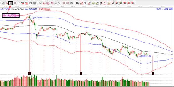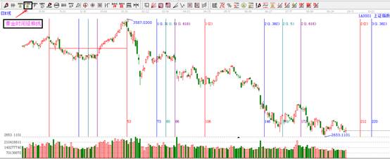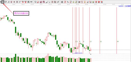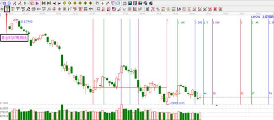 (三)實戰(zhàn)作用:依據(jù)工具所得出的豎線即為時間窗口,據(jù)此可提前預測指數(shù)和股價的上漲或下跌的時間周期,判斷可能發(fā)生趨勢反轉(zhuǎn)的時間轉(zhuǎn)折點。