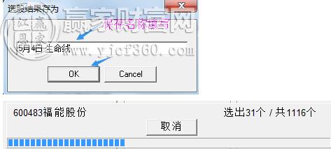 點(diǎn)擊【單條件選股】后,會彈出窗口【選股結(jié)果存為】窗口,填寫輸入后,點(diǎn)擊OK按鈕,會出現(xiàn)滾動條來執(zhí)行選股,結(jié)束后,點(diǎn)擊【關(guān)閉】按鈕即可完成。